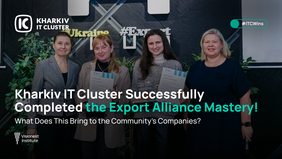 Kharkiv IT Cluster successfully completed Export Alliance Mastery by Visionest Institute (Estonia) — a free program for business support organizations. It helps improve consulting skills, develop strategic thinking, and support companies in entering international markets more effectively.