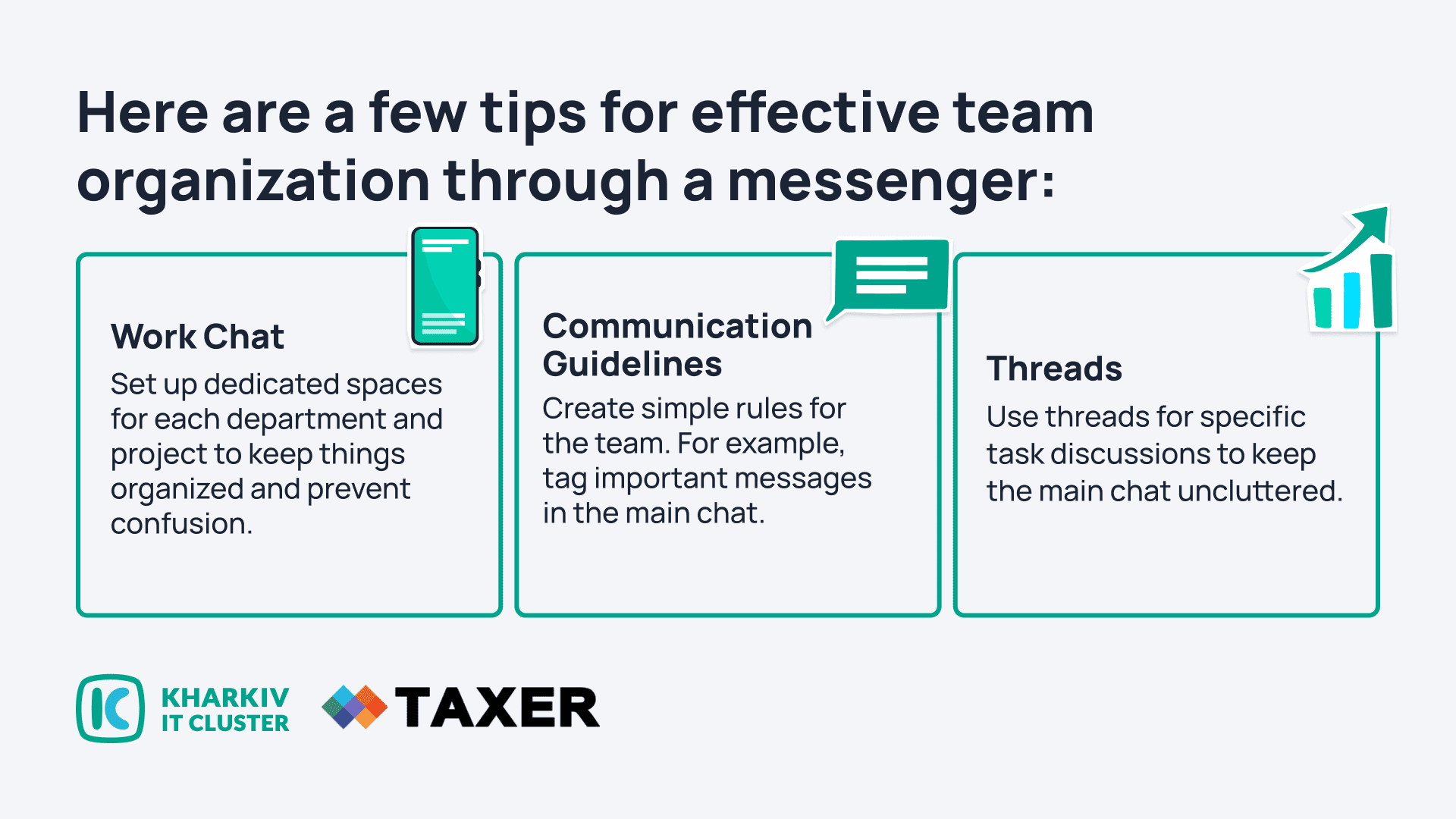 To avoid chaos, it's important to establish transparent processes and make good use of corporate tools. One of the key tools at TAXER is the corporate messenger. The main advantage of the messenger is the absence of information overload, allowing team members to stay focused on their tasks.