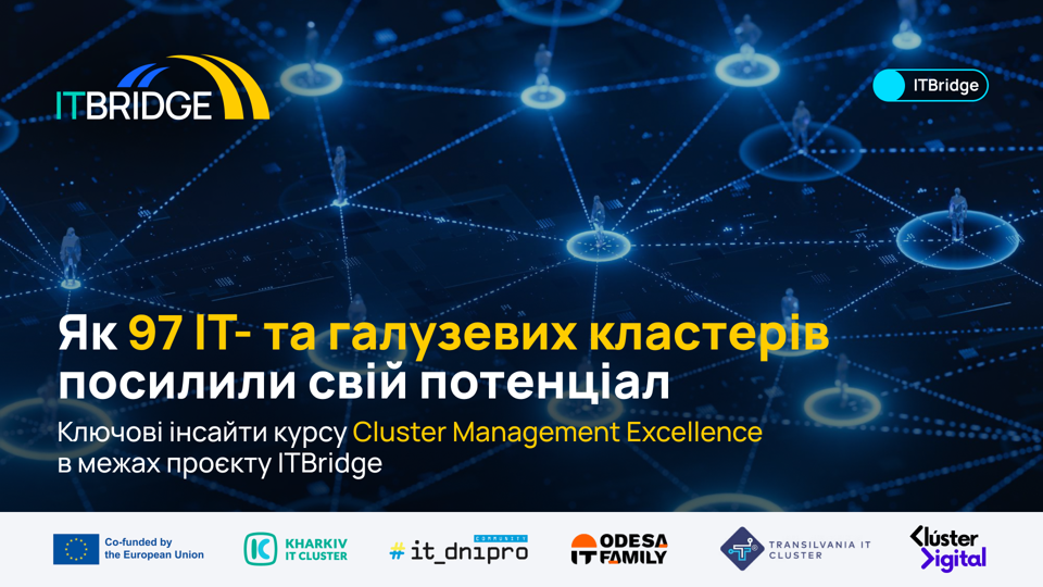 Курс з управління кластерами, Cluster Management Excellence, який реалізується в рамках проєкту ITBridge, успішно завершився. До участі в чотирьох інтенсивних воркшопах долучилися 97 кластерів та 189 представників кластерів із України та ЄС.