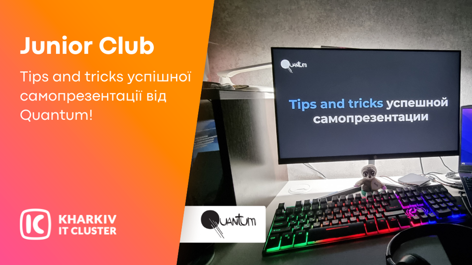 Ми дуже вдячні компанії Quantum за цікаву та корисну лекцію! А також особисто Катерині та Дар’ї за цікаву та практичну лекцію, де кожен міг побороти свою сором’язливість та зрозуміти чому якісна самопрезентація — це важлива навичка.Унікальний проєкт Junior Club від Kharkiv IT Cluster дає можливість молодим і талановитим людям розвиватися та здобувати цінний досвід для свого майбутнього в ІТ. Долучайся! 🤘