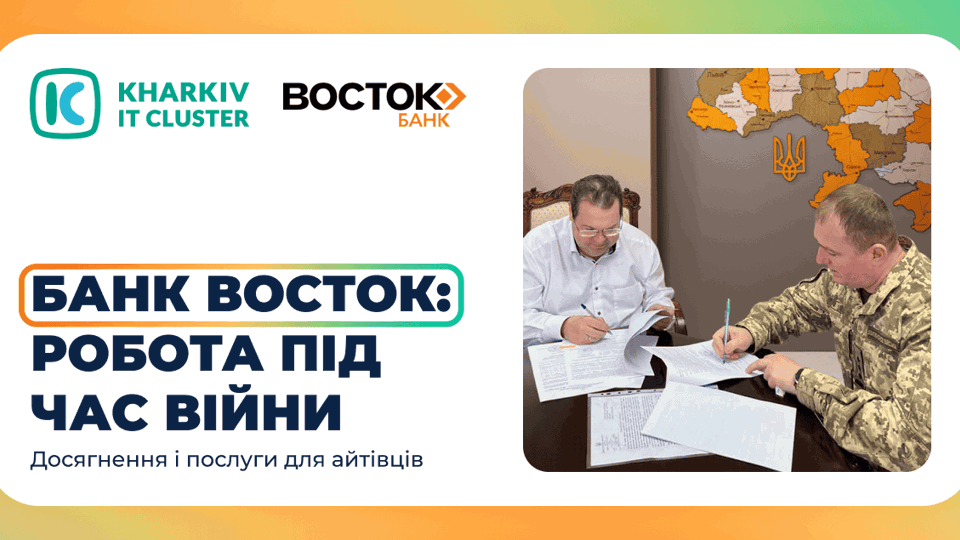 Банк Восток робить все можливе, аби надавати якісні послуги клієнтам та підтримувати їх у будь-які часи. Робота триває і вдосконалюється — робимо все заради Перемоги! Приєднуйтесь до Kharkiv IT Cluster — станьте частиною незламного ком’юніті, яке об’єднане спільними викликами і цілями.Підпишись на наш телеграм канал, щоб бути у курсі подій