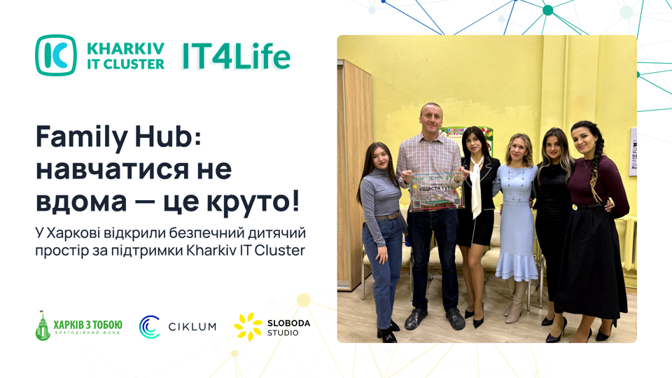 Family Hub «Щастя тут» — це освітній центр у Харкові, де діти можуть вчитися та розвиватися у безпечному середовищі. Завдяки співпраці БФ IT4Life, Kharkiv IT Cluster та БФ «Харків з тобою», було створено місце, яке відповідає всім потребам дітей та їхніх батьків. Ініціативу підтримали компанії Ciklum та Sloboda Studio, які допомогли обладнати простір усім необхідним.