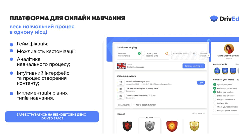 DrivEd - це не просто платформа для навчання, але і інструмент для стратегічного управління освітнім бізнесом. З найновітнішими інструментами DrivEd, освіта стає не лише ефективною, але й інноваційною. Запрошуємо вас на демо онлайн платформи для навчання DrivEd! Переконайтеся, як ця платформа зробить ваш освітній процес результативним. Натискайте на кнопку “Get Started”' на сайті https://drived.space/ та відкрийте новий вимір навчання!