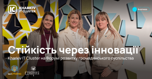 Усі новини5 грудня Kharkiv IT Cluster узяв участь у Форумі розвитку громадянського суспільства, який є ключовою платформою для взаємодії бізнесу, громадських організацій і державних струк...