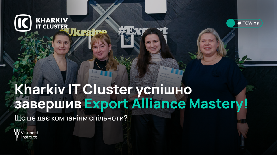 Харківський IT Кластер успішно випустився з Export Alliance Mastery від Visionest Institute (Естонія) — безоплатної програми для організацій, що підтримують бізнес. Метою було покращити навички консультування, навчитися стратегічно мислити та допомагати компаніям виходити на міжнародні ринки.