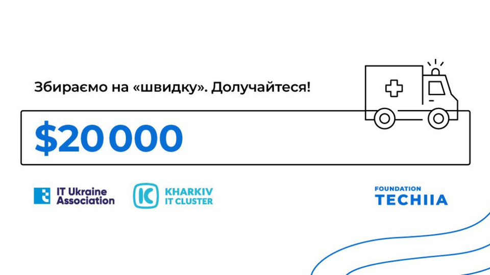 Асоціація IT Ukraine, Харківський ІТ Кластер та «Фундація Течія» розпочинають спільний збір коштів на дві карети швидкої медичної допомоги для Харкова. Фінансова мета – 20 тис. USD. Карети швидкої допомагатимуть захисникам Харківської області якнайшвидше транспортувати поранених з «гарячих точок» до фельдшерських пунктів та госпіталей. За місяць кожна така машина, завдяки своєчасній медичній допомозі, зможе зберегти понад 600 життів! Доєднайтесь до порятунку наших захисників! Перерахувати кошти можна на сторінці ініціативи на сайті ГО «Фундація Течія» у будь-який зручний спосіб:
