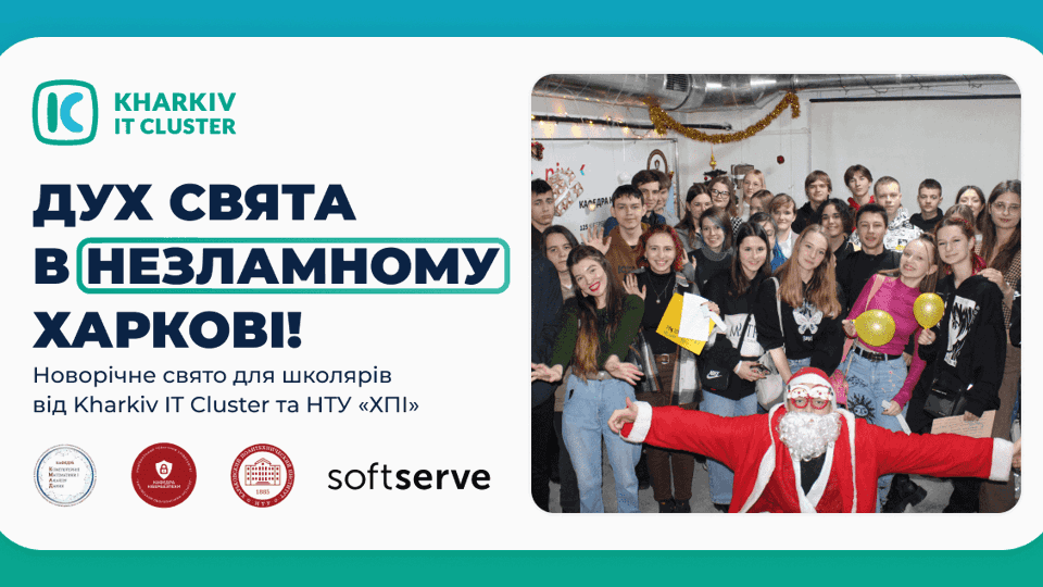 Kharkiv IT Cluster дякує кафедрам прикладної математики й аналізу даних та кібербезпеки НТУ «ХПІ» за співорганізацію та яскраві емоції, а також компанії SoftServe за пам’ятні подарунки для школярів.