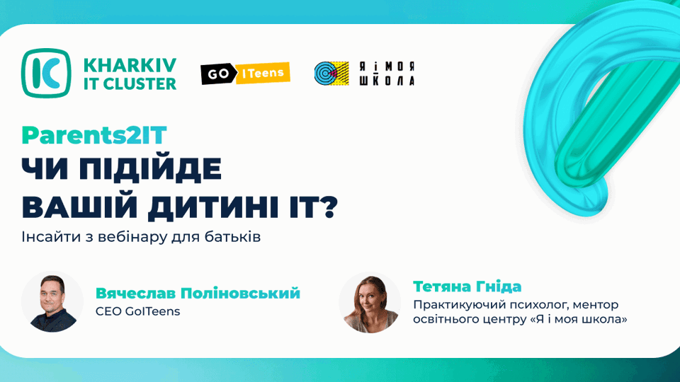 11 жовтня в межах проєкту Parents2IT від Kharkiv IT Cluster відбувся вебінар для батьків із CEO онлайн ІТ-академії для дітей та підлітків GoITeens  Вячеславом Поліновським s психологом-практиком, тренером для тренерів і ментором освітнього центру «Я і моя школа» Тетяною Гнідою.  Вячеслав Поліновський має понад 12 років досвіду управління освітніми брендами, Тетяна Гніда — 20-ти річний досвід професійної діяльності, звання PhD. На онлайн-зустрічі спікери розповіли, як допомогти дитині обрати майбутню  професію та побудувати успішне майбутнє. Найцікавіше з вебінару виклали в статті нижче 👇