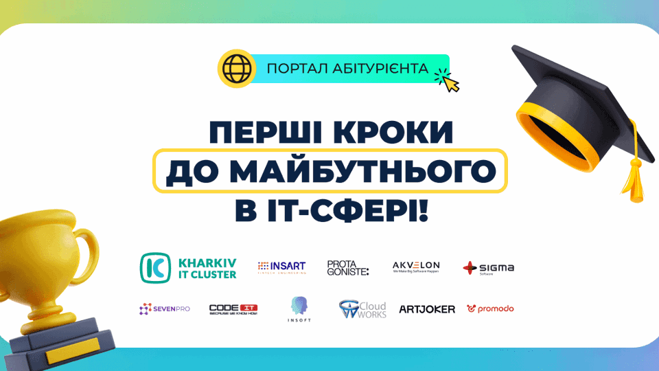 Компанії Харківського ІТ Кластера не стоять осторонь вступної кампанії 2023. За підтримки ІТ-компаній Kharkiv IT Cluster: Insart, h8 games, Akvelon, Sigma Software, SevenPro, CodeIT, Insoft Global, Cloud Works, ARTJOKER та маркетингової агенції Promodo, ми маємо змогу розширити можливості Порталу ІТ-абітурієнта та забезпечити наповнення якісною інформацію для абітурієнтів, яку побачать сотні тисяч вступників цього року. Понад 10,5 млн показів інформації про Портал ІТ-абітурієнтів та 80+ тисяч переходів на сайт порталу було забезпечено в межах маркетингової кампанії з квітня 2023 року. Та ми не зупиняємося та продовжуємо інформувати абітурієнтів про актуальні ІТ-спеціальності! 💼Портала ІТ-абітурієнта — це онлайн-ресурс, створений з метою надання важливої та корисної інформації для абітурієнтів, які планують вступити до університетів та отримати професійну освіту в галузі інформаційних технологій.