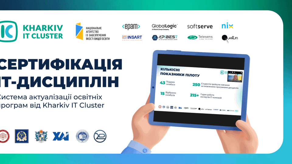 Пілотний проєкт «Система сертифікація ІТ-дисциплін» Харківського ІТ Кластера — це унікальний проєкт, який є важливою ініціативою для освіти в Україні. До розробки проєкту долучилося понад 25 ІТ-компаній-роботодавців, 6-ть експертів з університетів м. Харкова та представники Національного агентства із забезпечення якості вищої освіти, ґрунтуючись на більш ніж 5-ти річному досвіді реалізації проєктів експертів Kharkiv IT Cluster з оновлення понад 100 освітніх програм в провідних університетах Харкова та України.