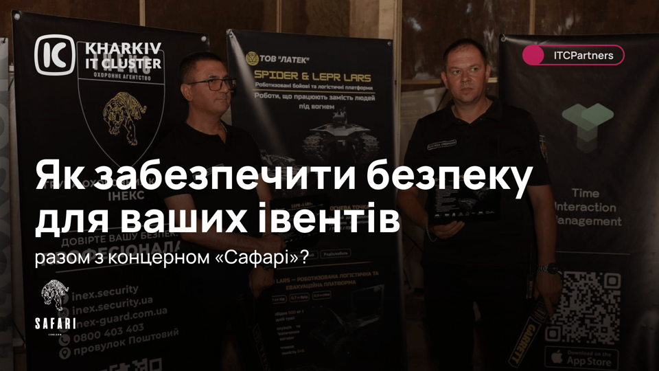 У нашому випадку — це концерн «Сафарі». Вони є партнерами Kharkiv IT Cluster з 2022 року і відповідають за безпеку наших великих івентів. Він об’єднує кілька напрямів, які разом формують повну екосистему безпеки: