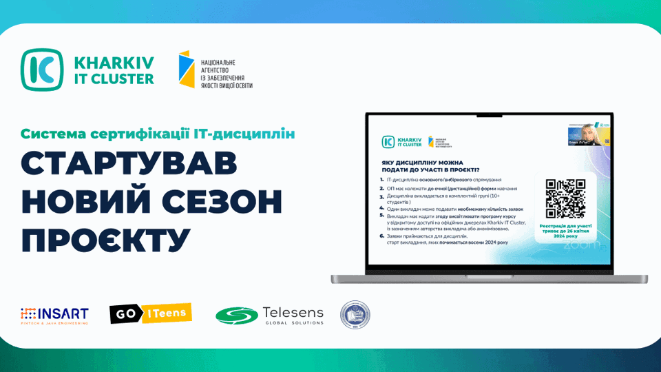 18 квітня 2024 року Харківський ІТ Кластер спільно з Національним агенством із забезпечення якості вищої освіти презентував новий сезон проєкту «Система сертифікації ІТ-дисциплін»‎.  До заходу долучилися понад 150 учасників, це представники університетів з усієї України: викладачі, керівництво, керівники ІТ-компаній, члени освітньої експертної групи й представники Національного агенства із забезпечення якості вищої освіти. Проєкт «Система сертифікації ІТ-дисциплін» спрямований на покращення якості вищої освіти шляхом синергії бізнесу й освіти. Він започаткований із метою актуалізації ІТ-дисциплін та їхнього оновлення, згідно із сучасними потребами бізнесу, а також для зменшення періоду адаптації фахівців у компаніях. Мета проєкту — синхронізувати знання, уміння й навички 100% випускників IT-напрямів України, щоб вони відповідали вимогам IT-компаній до молодших (junior+) фахівців.