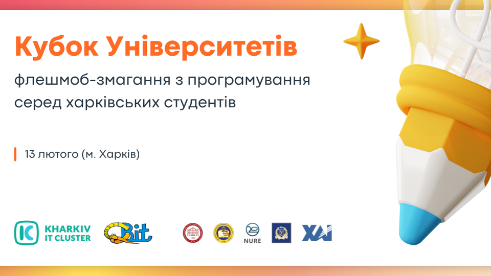 🏆 «Кубок Університетів» – це флешмоб-змагання з програмування серед студентів університетів міста Харкова! 🧨 Взяти участь у проекті можуть студенти будь-яких курсів будь-яких спеціальностей! Не обов'язково бути гуру в програмуванні або навчатися на технічній спеціальності. Достатньо вміти трішки думати, аналізувати та навчитися писати невеличкі програми! ☝️ «Кубок Університетів» – це міська ініціатива Молодіжного наукового товариства Q-BIT та Kharkiv IT Cluster, що проводиться за підтримки компанії Near! Для участі в проекті необхідно: зареєструватися Реєстрація Підготуватися до кубка можна в рамках тренувальних змагань, які будуть доступні після реєстрації. 📅 Тренувальні вправи стартують 17 січня 📅 Кубок Університетів відбудеться 13 лютого Давайте покажемо, що: програмування − це просто, фундаментальні знання − це круто, Харків − найкраща локація для навчання та розвитку сучасних технологій!