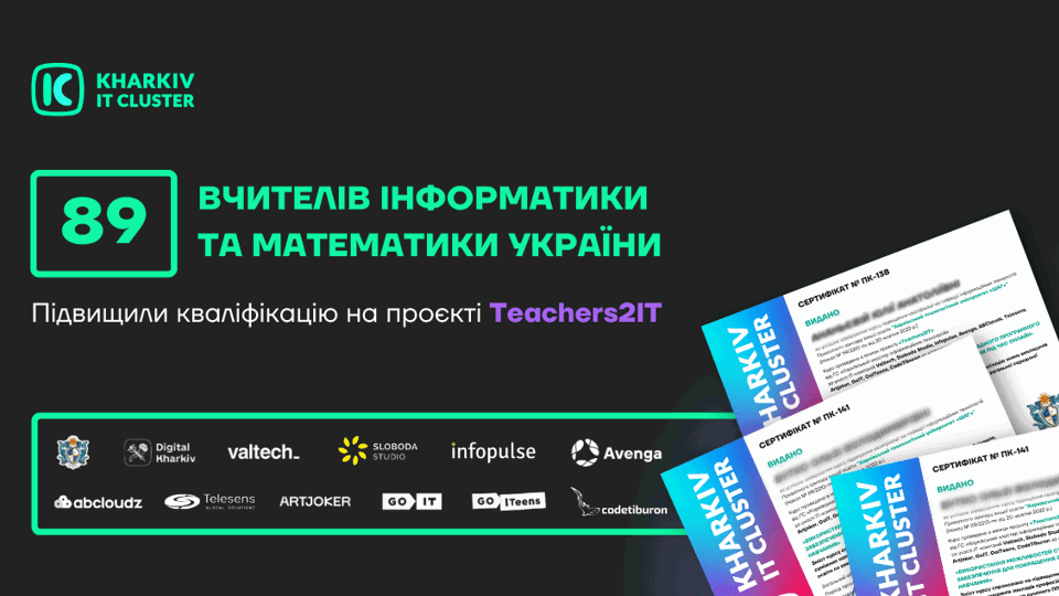 🙂 Kharkiv IT Cluster дякує вчителям та ІТ-компаніям за те, що в час наповнений перепонами ви продовжуєте розвиватись та розвивати освітній напрямок в Україні! Натомість ми продовжимо формувати сприятливе середовище для формування майбутніх ІТ-фахівців через освітні проєкти, які розпочнуться в 2023 році. Щоб стати частиною ком'юніті вчителів інформатики й математики, вступайте до чату:Чат учасників проєкту Teachers2IT
