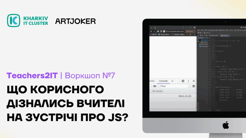 😊 1 грудня відбувся Воркшоп №7 для 63 вчителів інформатики та математики у рамках проєкту Teachers2IT. 📢 Євген Чвєртков, Head of education department у компанії Artjoker Software, поділився власними знаннями з теми «Базові концепції JS. Використання JS на практиці для написання найпростіших вправ». Учителі дізналися про: ❗ Синтаксис у JS — основні речі; ❗ Можливості роботи інспектора в браузері; ❗ Які механізми підключення існують та яким чином виконується робота JS на стороні клієнта; ❗ Основні можливості JS; ❗ Як виконувати вправи за допомогою використання основних операторів: умови, цикли, розгалуження та інші.