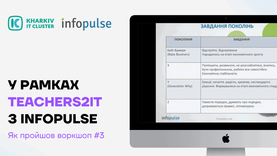 🔥 3 листопада пройшов третій online-воркшоп від Kharkiv IT Cluster в рамках проєкту Teachers2IT. На зустріч доєднались 95 вчителів із усієї України. 📢 Лалі Ліпартеліані-Бєдоєва — Senior HR Business partner з компанії Infopulse — на зустрічі детально розкрила тему «Особливості мотивації школярів у розрізі теорії поколінь».
