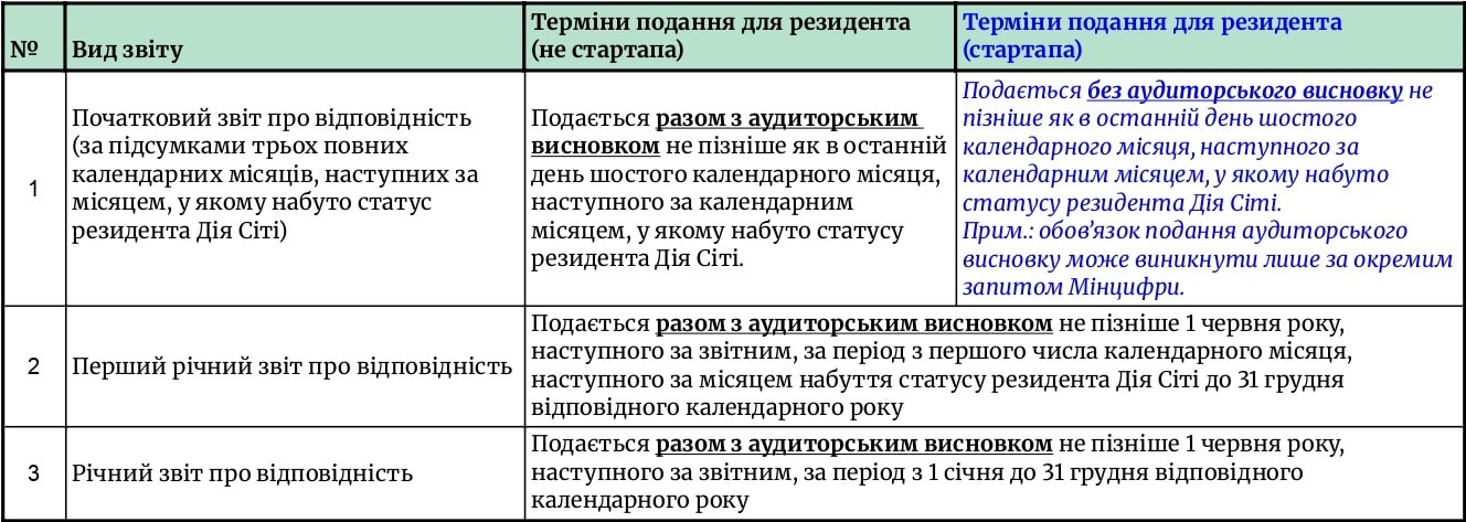 Кожна компанія-резидент щороку подає Звіт про відповідність з аудиторським висновком. Запізнення понад 20 робочих днів — ризик втратити статус. За вимогами Закону № 1667-IX, кожен резидент Дія.City має подати три основні типи звітів: