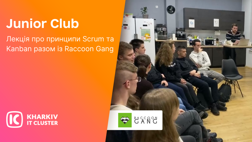 9-го грудня відбулася чергова зустріч у рамках проєкту Junior Club від Kharkiv IT Cluster 9-го грудня пройшла закрита лекція для Junior Club (JC). Лекція була в офісі Raccoon Gang, де перед початком лекції учасникам провели екскурсію по офісу і розповіли як побудований робочий процес, а потім за чашкою чаю вони дізнались про Основні принципи Scrum та Kanban. Михайло Шипер, Delivery manager у Raccoon Gang, знає все про Agile. Спікер поділився поділився своїми знаннями на лекції «Принципи Scrum та Kanban».