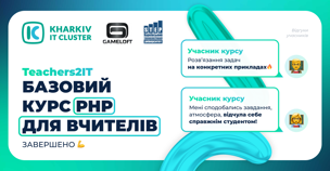 Читати повністю11 березня завершився курс від компанії Gameloft проєкту Teachers2IT від Kharkiv IT Cluster «Основи вебпрограмування за допомогою PHP», який затверджений на базі Харківського те...