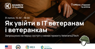 Читати повністю31 липня Kharkiv IT Cluster запрошує на відкриту зустріч у межах програмиVeterans2Tech — ініціативи, що допомагає ветеранам і ветеранками стартувати в технологічній галузі й зна...