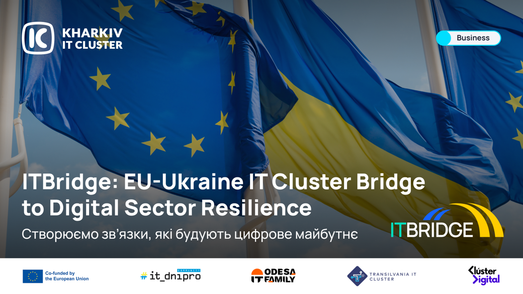 ITBridge — це амбітна ініціатива, яка об’єднує провідні IT-кластери України та ЄС для довгострокової співпраці та розвитку цифрових інновацій. У проєкті беруть участь три найбільші IT-хаби України — Kharkiv IT Cluster, Dnipro IT Community та Odesa IT Family, а також два європейські IT-кластери — Transilvania IT Cluster (Румунія) таCluster Digital of Catalunya(Іспанія). Разом ми зміцнюємо бізнес-зв’язки, інтегруємо українські IT-компанії у європейські цифрові ринки та сприяємо цифровій трансформації обох регіонів.